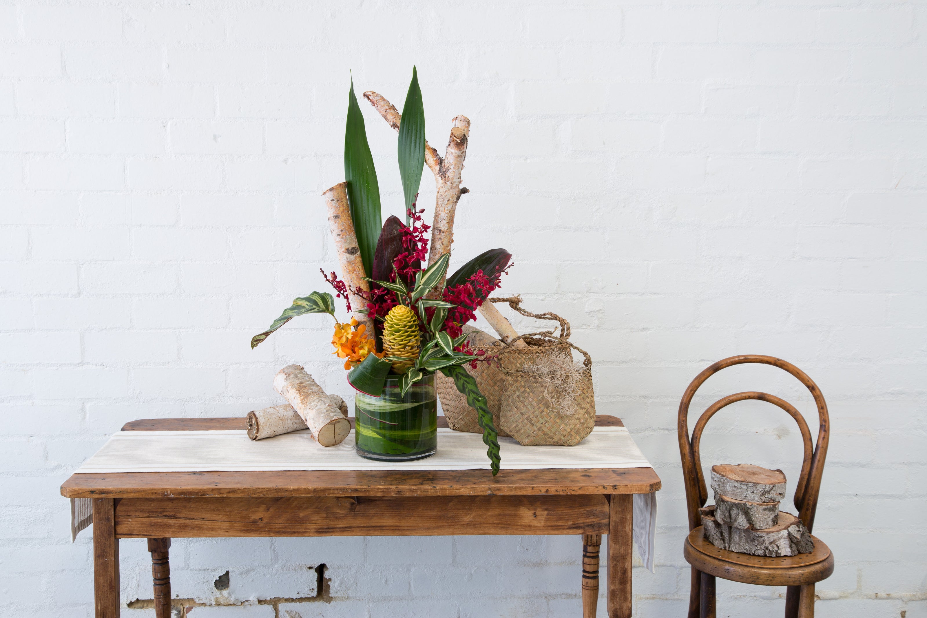 Often seen in home settings, this spectacular arrangement teaches you how to work with standout tropicals and create a linear design, emphasising negative space and natural lines.